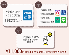 以前のぐるなびより低コストで、GoogleやLINE、Instagram、tripadviserなど多くの媒体との連携が可能となり、楽天会員(約1億人以上)にお店をアプローチすることができるようになりましたので、さらに集客効果が高くなるような仕様となりました。